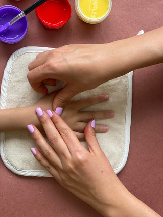 1. Apply finger paint onto your hand using a paintbrush. Firmly press your hand onto the blank pot holder.